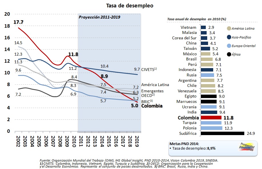El Plan Nacional de Desarrollo (PND) 2010-2014 ‘Prosperidad para Todos’ propone una meta de desempleo para Colombia del 8,9% en 2014 y el plan ‘Visión Colombia Segundo Centenario: 2019’ propone una meta del 5,0% en 2019.