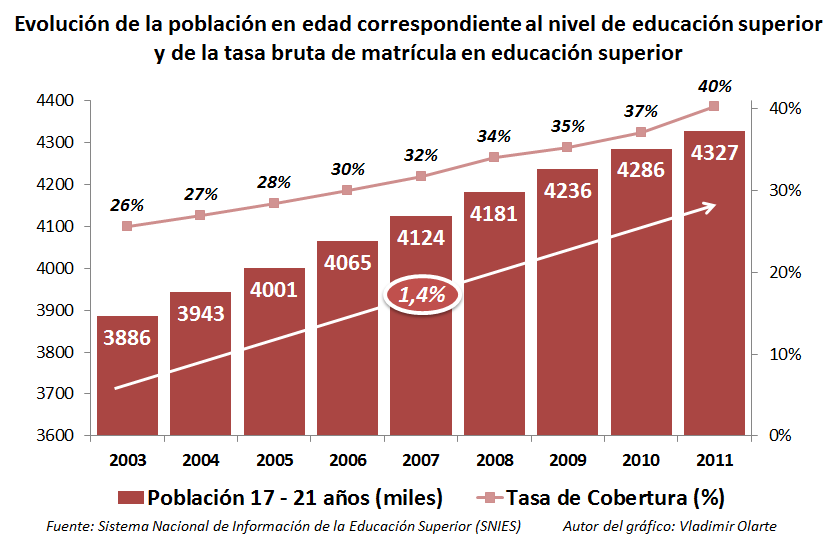 En Colombia los jóvenes en edad de acceder a la educación superior son actualmente 4,3 millones según el Departamento Administrativo Nacional de Estadística (DANE). Cada año este grupo poblacional crece en promedio 1,4%. Esta tasa representará en el año 2012 unos 60.200 jóvenes más que en el año 2011. A pesar que la proporción que efectivamente accede a educación superior es aún reducida, viene en aumento. En el año 1997 (cuando yo me gradué del bachillerato) la cobertura era de 12% y una década después, en 2007, fue de 32%. Desde entonces continuamos presentando avances y el dato más reciente que reporta el Sistema Nacional de Información de la Educación Superior (SNIES) es una tasa bruta de cobertura en educación superior de 40,3% en 2011. Este motivo de optimismo se evidencia en la siguiente gráfica: