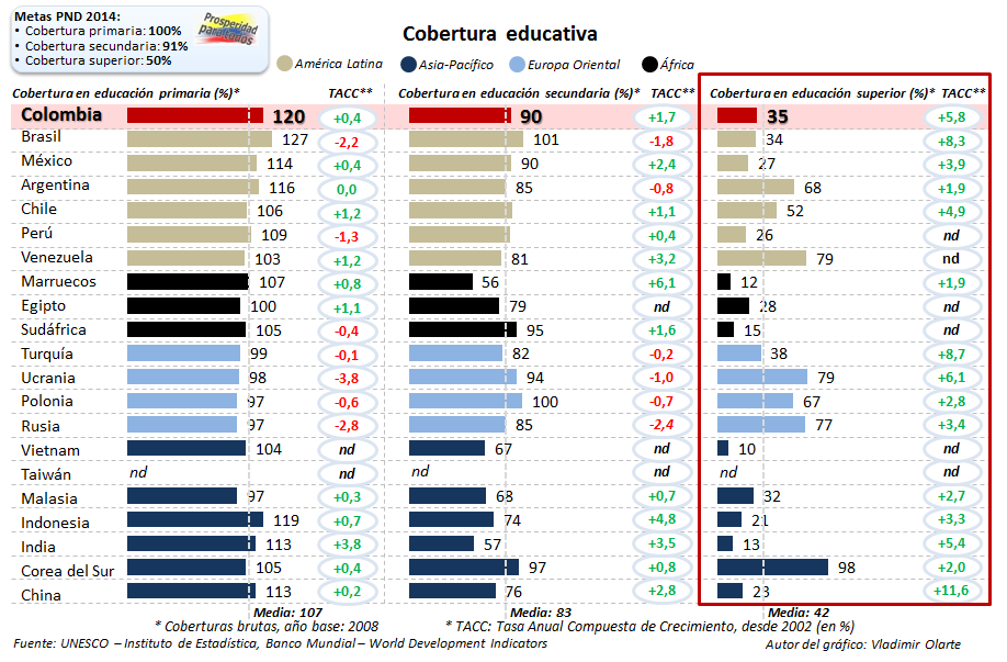 Además de la estimativa anterior, una comparación internacional confirma que aún nos queda un importante camino por recorrer en cobertura. Colombia está bien en cobertura bruta de primaria y menos bien en cobertura bruta de secundaria, pero nos quedamos atrás en las cobertura de educación superior. Tomando como año base 2008 con datos de la Organización de las Naciones Unidas para la Educación, la Ciencia y la Cultura (UNESCO), nuestra Colombia, que entonces tenía una cobertura de 35% en educación superior, estaba lejana de países como Corea del Sur con 98%, Polonia con 79%, Venezuela con 79%, Rusia con 77% y Argentina con 68%. Sigue la gráfica: