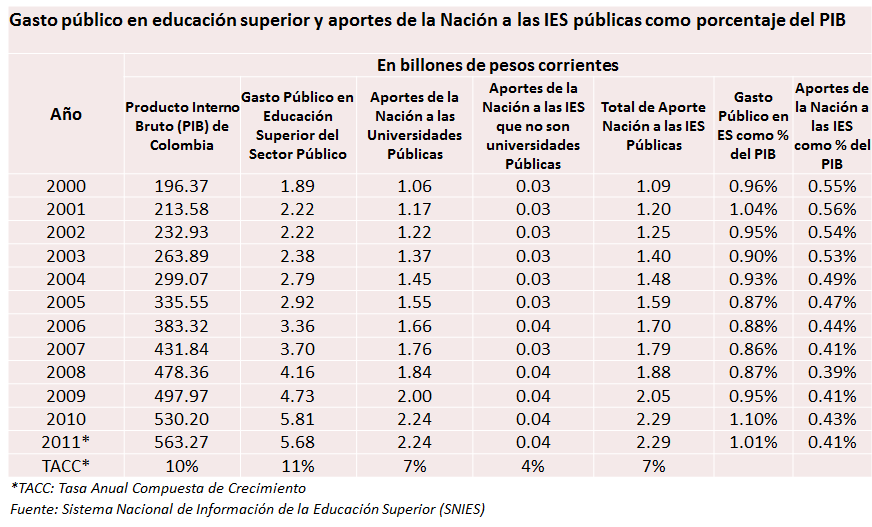Buena parte del mayor dinamismo presentado por las IES públicas se debe al creciente gasto (tanto de funcionamiento como de inversión) del Gobierno en la educación superior del sector público colombiano. Este creció 11% en promedio por año: de COP$ 1,89 billones en el año 2000 a COP$ 5,68 billones en 2011, representando aproximadamente el 1% del producto interno bruto (PIB) del país. Sigue un gráfico que ilustra la evolución reciente del gasto público en educación superior, cuya fuente es el SNIES: